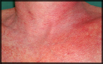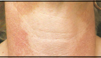 EL TIPICO INESTETICISMO QUE SE APRECIA EN LA IMAGEN, CORRESPONDE CON UNA POIQUILODERMIA DE CUELLO Y ESCOTE DE NATURALEZA MIXTA YA QUE TIENE UN COMPONENTE VASCULAR Y OTRO PIGMENTARIO ORIGINADO EN UN EXCESO DE PRODUCCIÓN DE MELANINA Y VASOS SANGUINEOS EN LA ZONA.